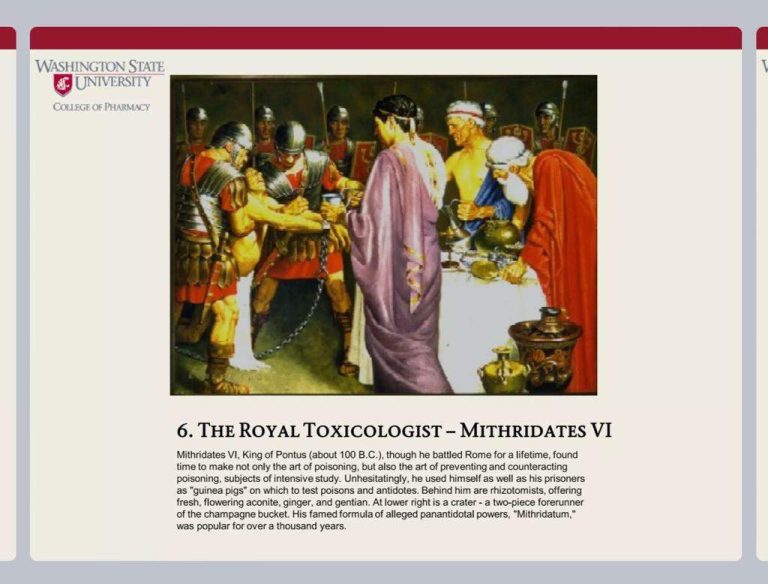 VI. Mithridates, Pontus Kralı (MÖ 100 civarı), ömür boyu Roma’yla savaşmasına rağmen, zehirleme sanatını sadece bir hobi olarak değil, aynı zamanda zehirlemenin önlenmesi ve karşı konulması sanatını da yoğun bir