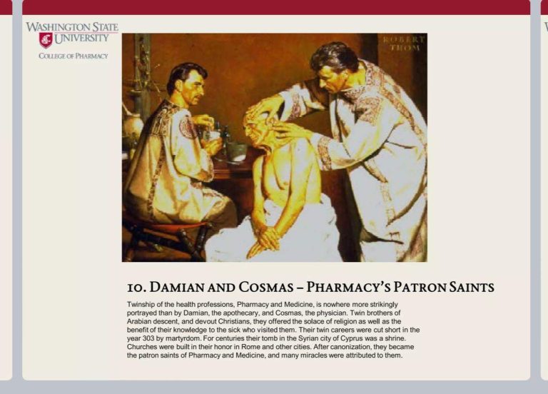 Eczacılık ve tıp arasındaki meslek kardeşliği hiçbir yerde Eczacı Damian ve Doktor Cosmas’daki gibi daha çarpıcı şekilde tasvir edilmemiştir. Arap kökenli ikiz kardeşler, dindar Hristiyanlardı ve bilgilerinin yanı sıra hastalarına