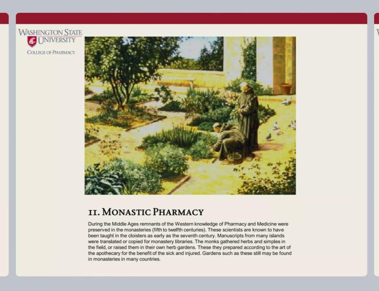 Orta Çağ’da, Batı’daki eczacılık ve tıp bilgisinin kalıntıları manastırlarda korunmuştur (beşinci ile on ikinci yüzyıllar arası). Bu bilim adamlarının, yedinci yüzyıldan itibaren manastırlarda öğretildikleri bilinmektedir. Birçok el yazması manastır kütüphaneleri
