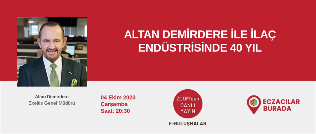 Ekim ayına başlarken ilk etkinliğimizi Exeltis’de genel müdür olan değerli eczacı Altan Demirdere ile yapıyoruz. İlaç endüstrisini, Altan Demirdere’nin kariyer yolculuğunu dinleyeceğimiz keyifli bir etkinlik olacak.